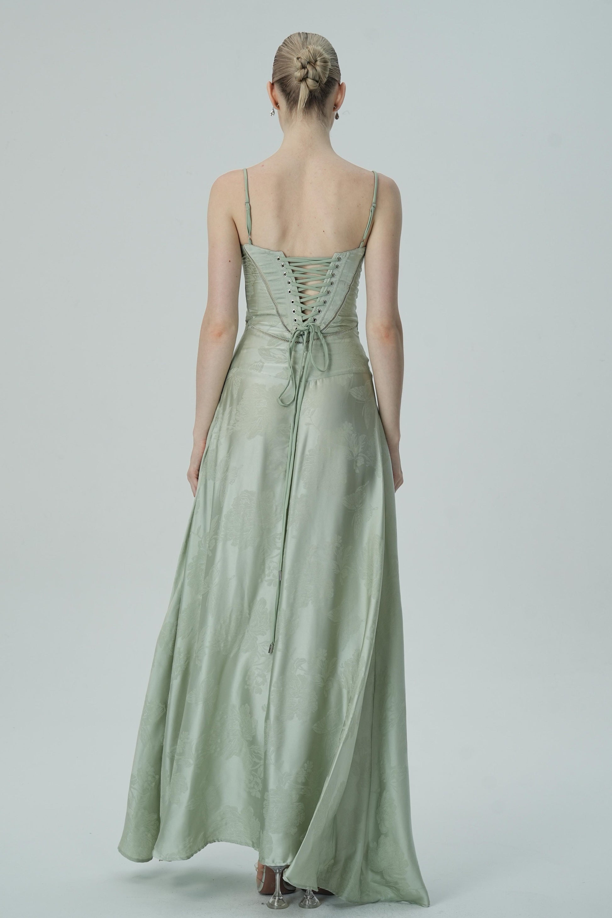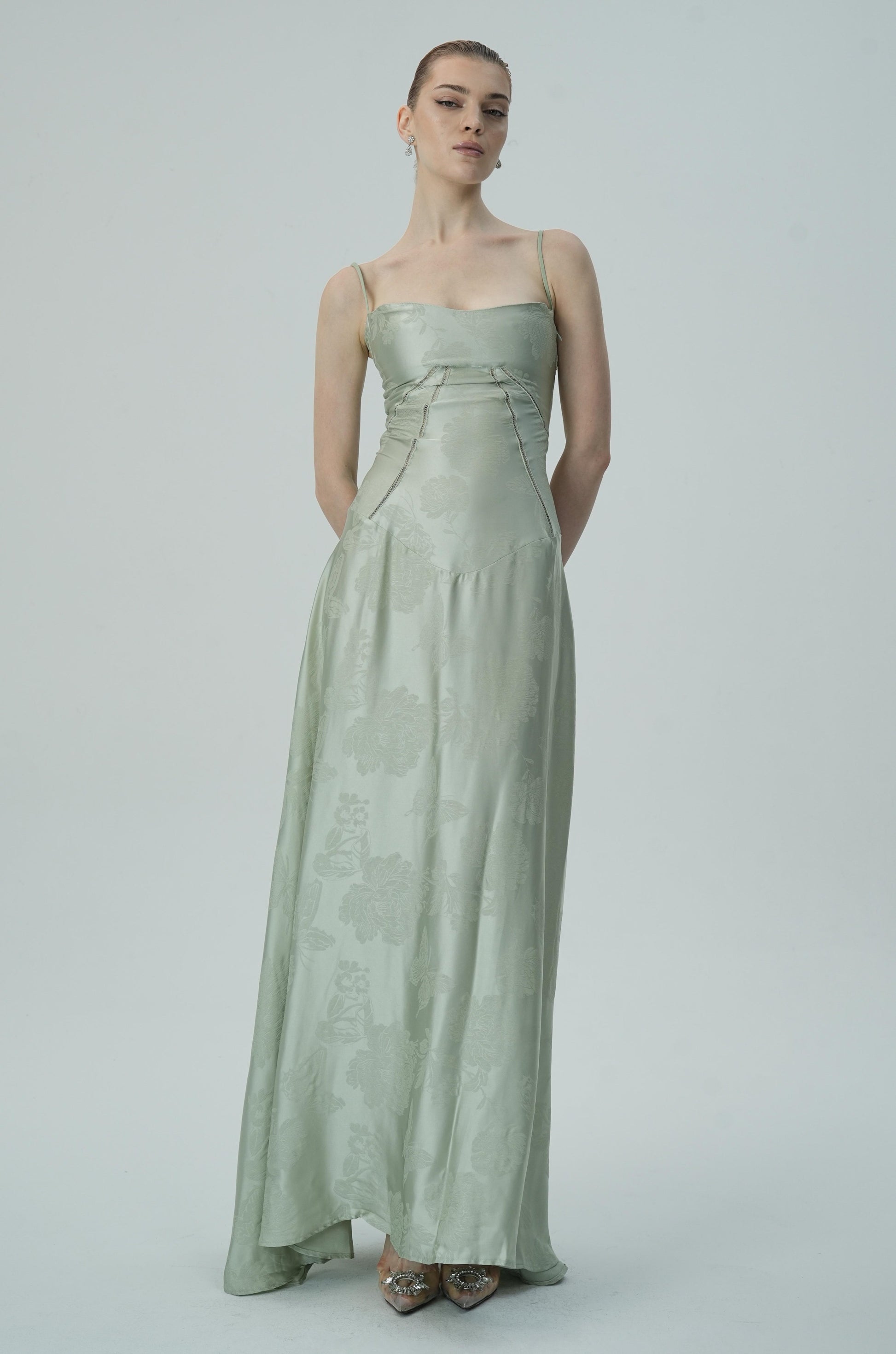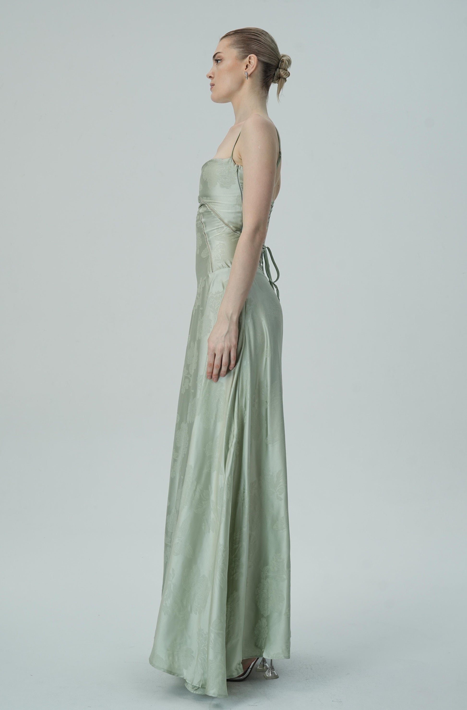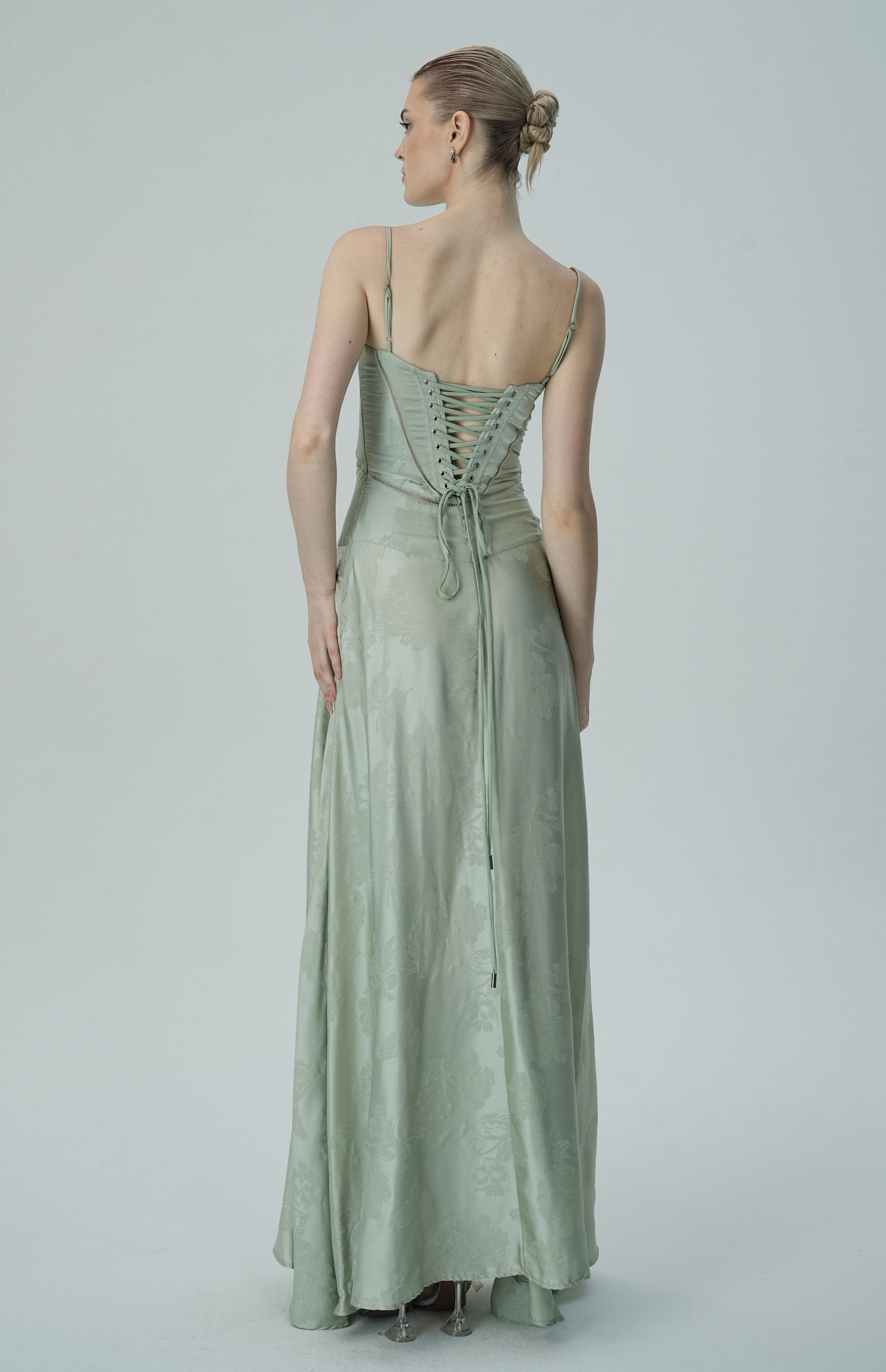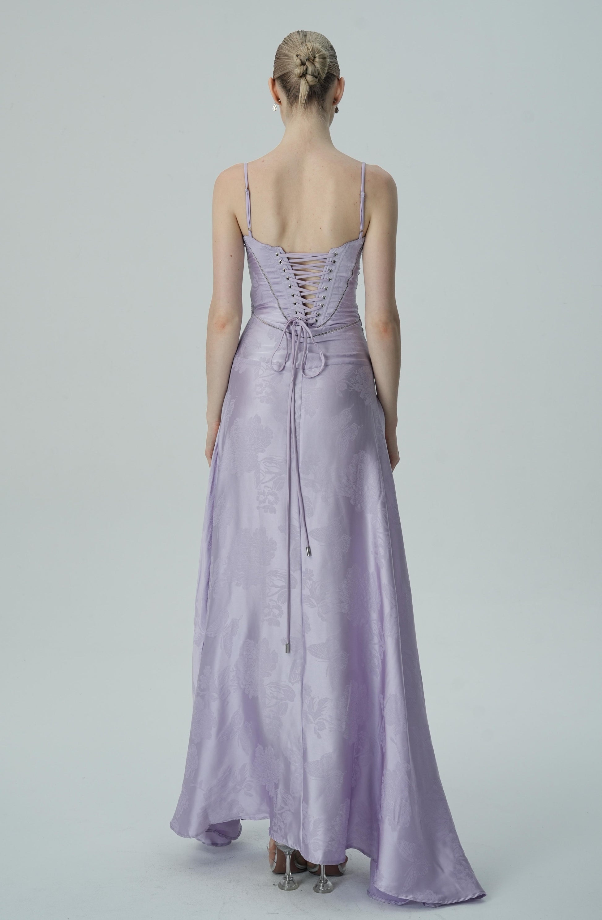 Bu göz alıcı lavanta rengi saten maxi elbise, zarif çiçek jakar deseni, ince askıları ve akıcı etek kesimiyle sofistike ve lüks bir görünüm sunuyor. Vücuda oturan korsaj üstü, figürü mükemmel bir şekilde tamamlayarak şık ve feminen bir siluet oluştururken, maxi boy eteği zarif ve akıcı bir hareket sağlar.