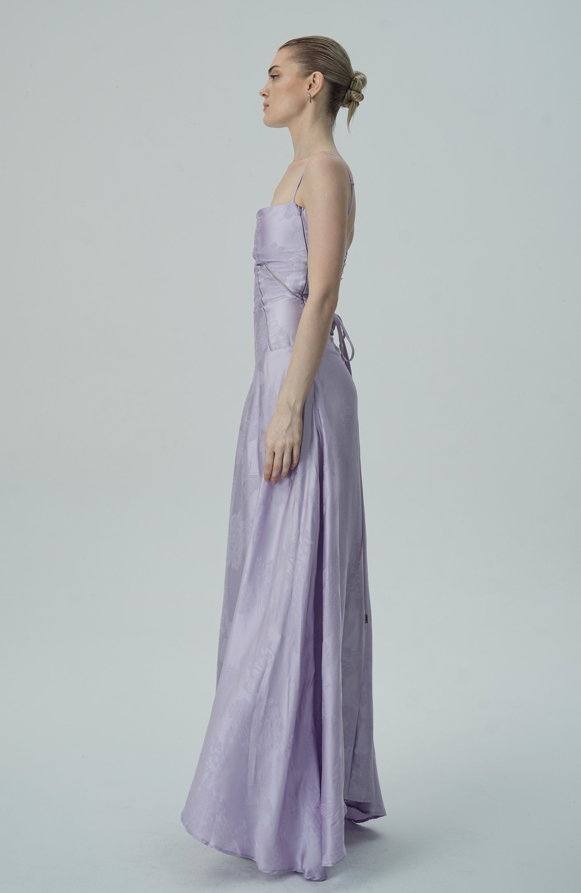 Bu zarif lavanta saten maxi elbise, düğünler, gala geceleri, kokteyl davetleri ve özel etkinlikler için mükemmel bir seçimdir. Zamansız ve büyüleyici tasarımıyla her ortamda sofistike bir etki yaratın!