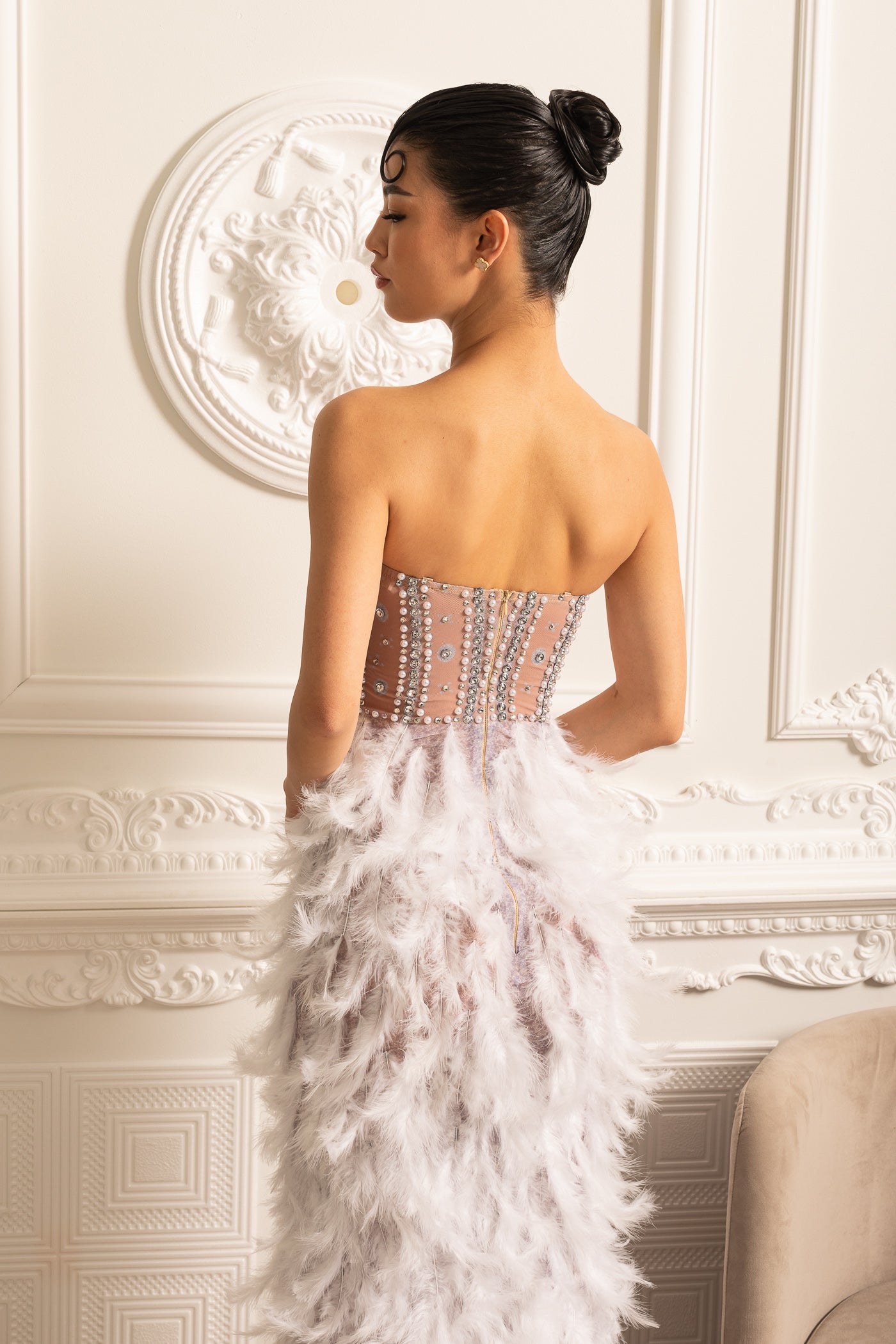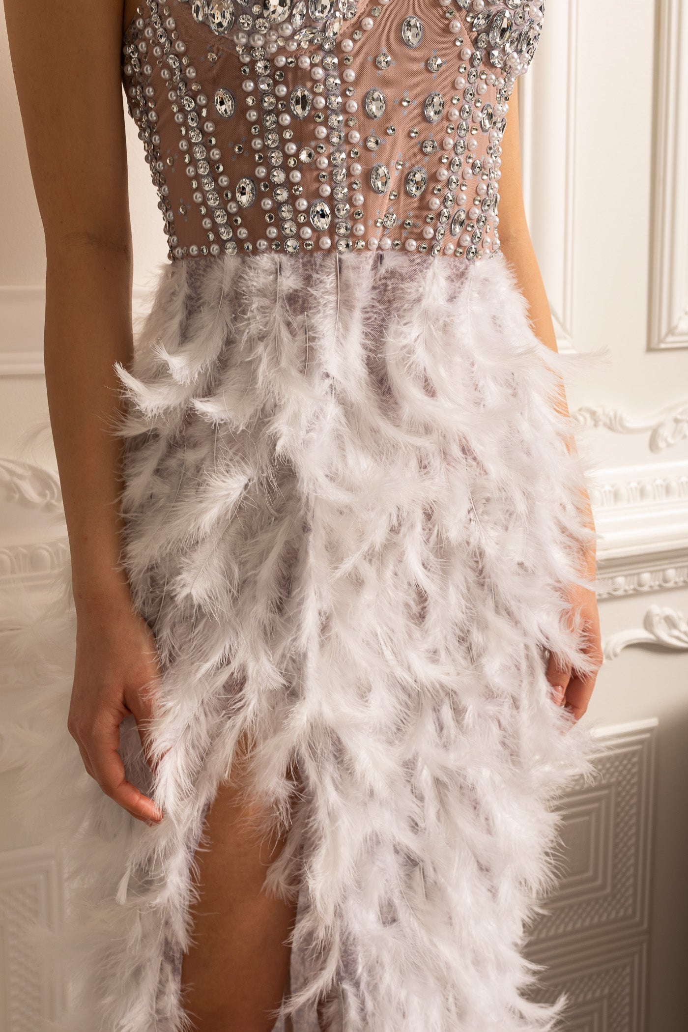 Lüks Tüy Süslemeli Payetli Straplez Elbise