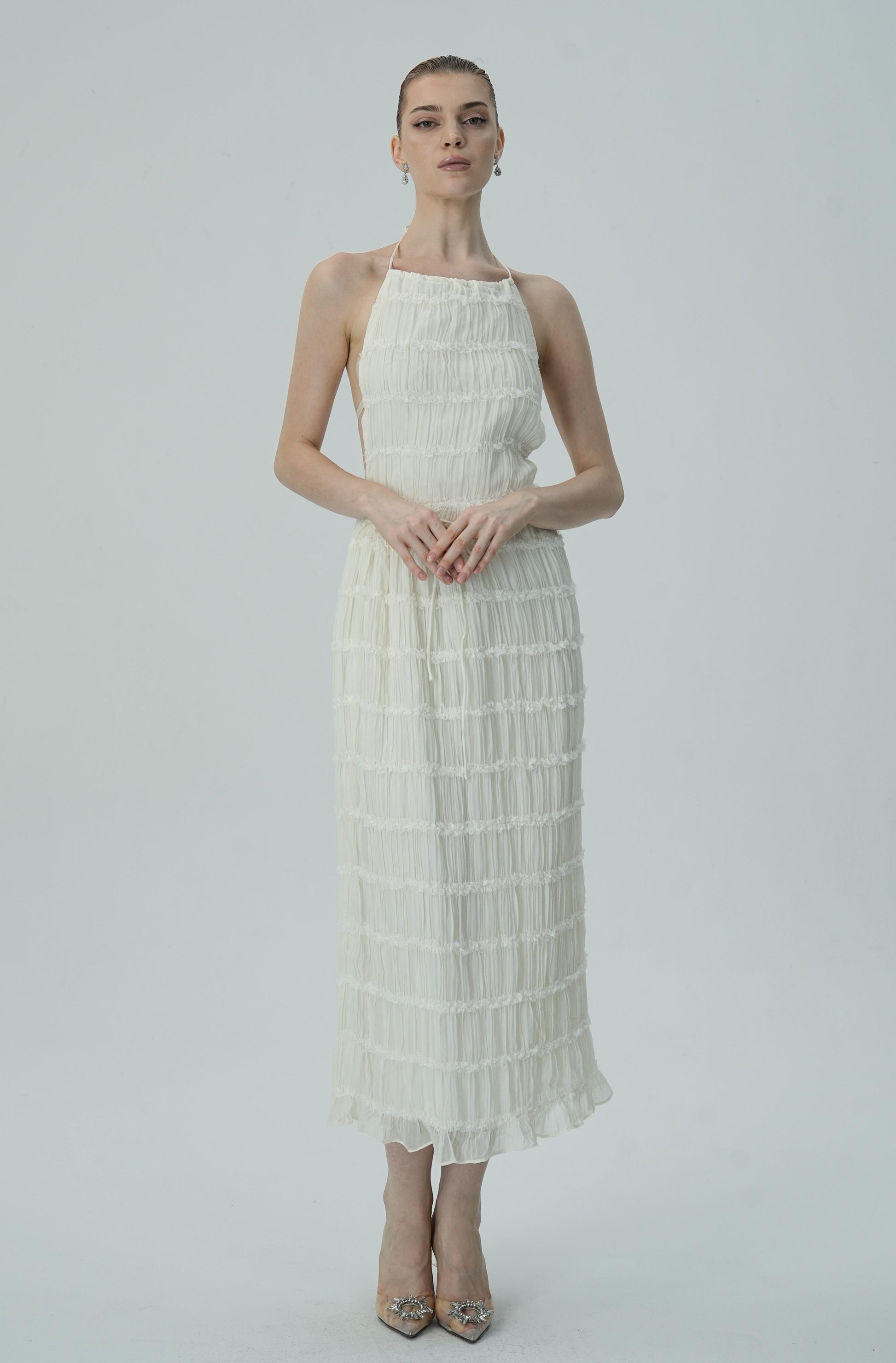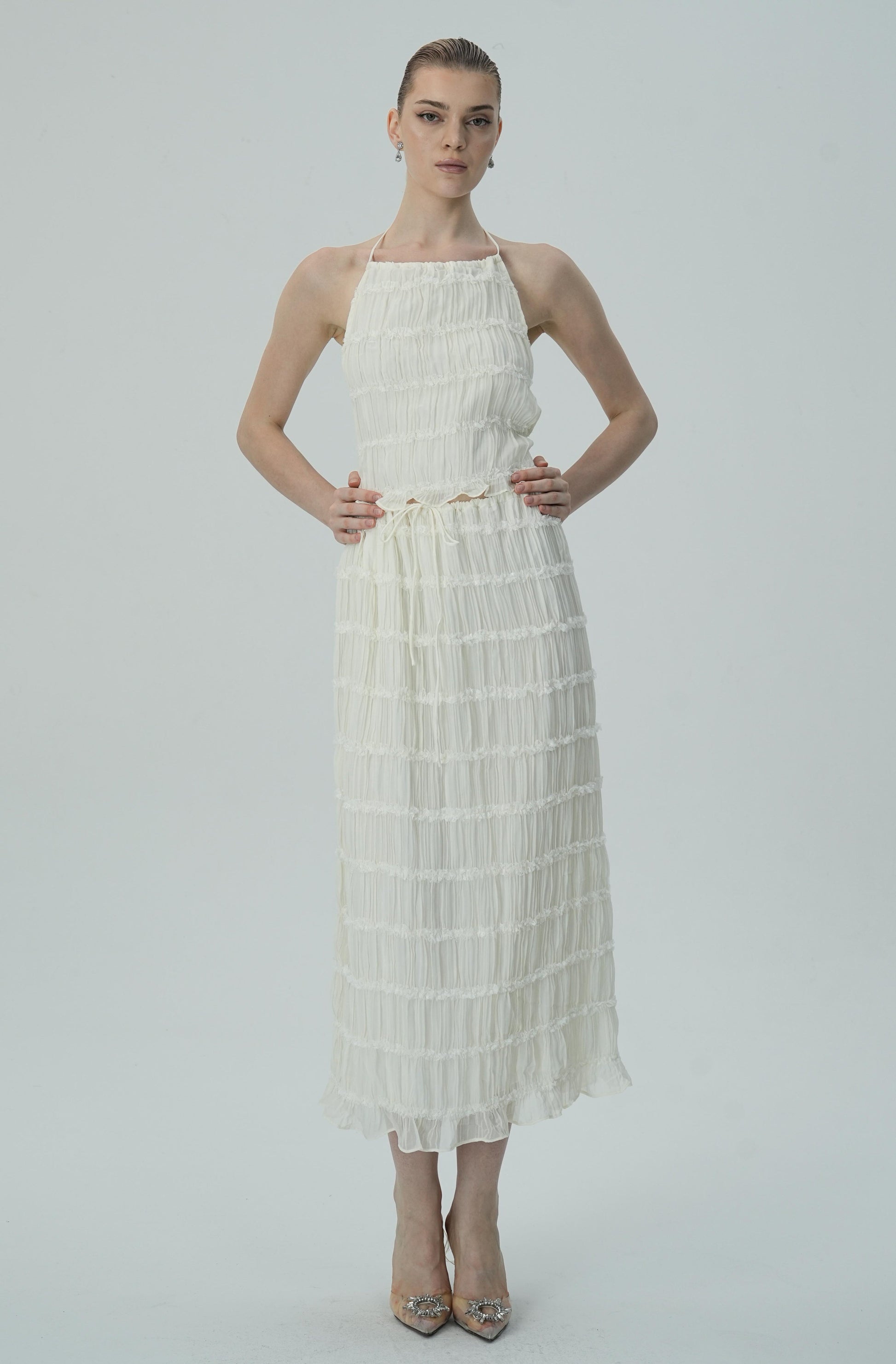Kolsuz Mürettebat Yaka Pileli Kemersiz Uzun Elbise