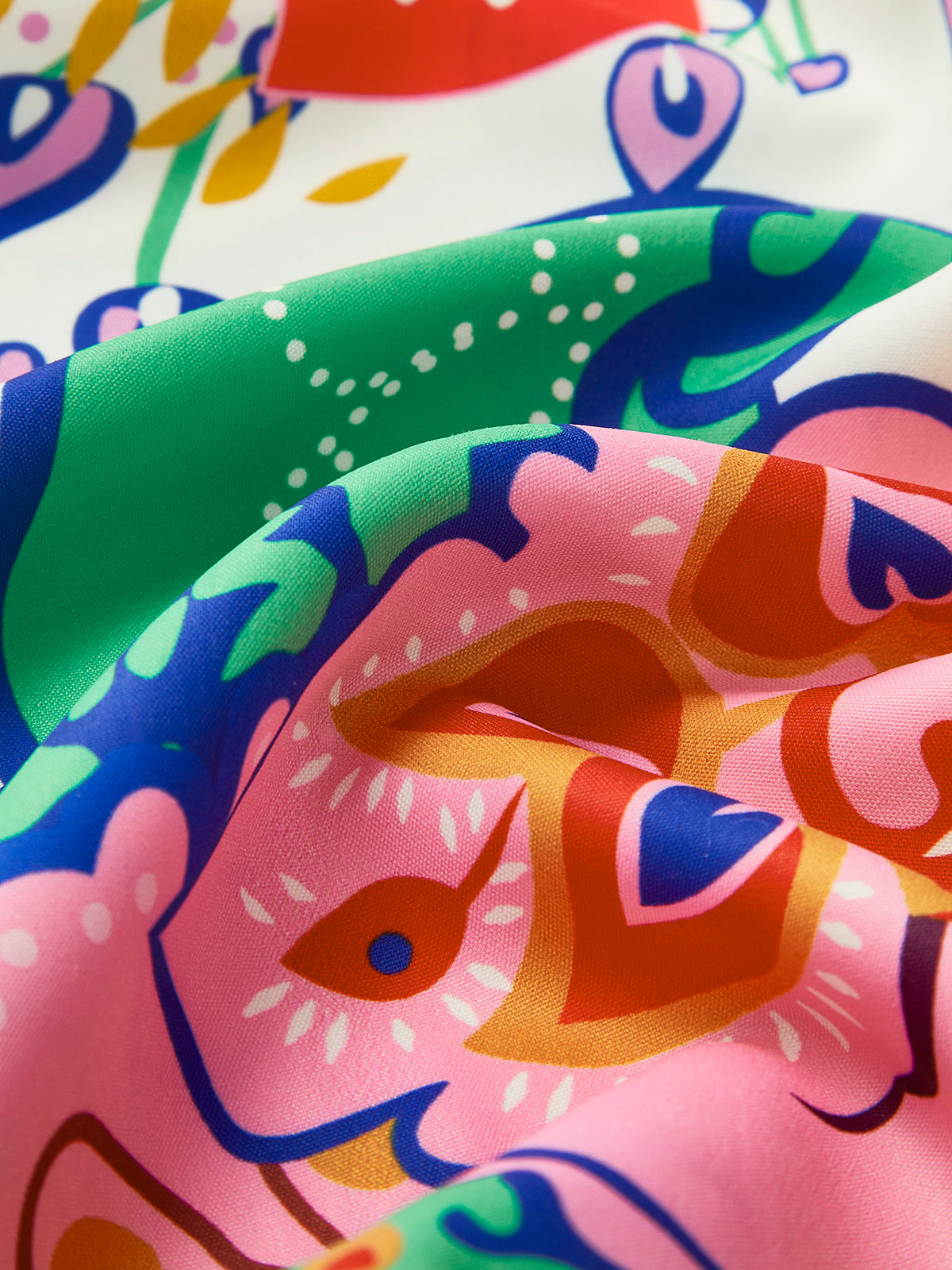 Baskılı V Yaka Fener Kollu Kısa Elbise