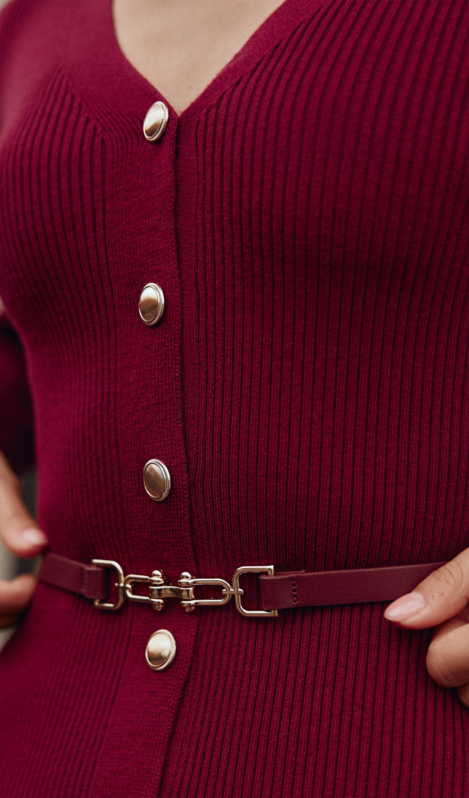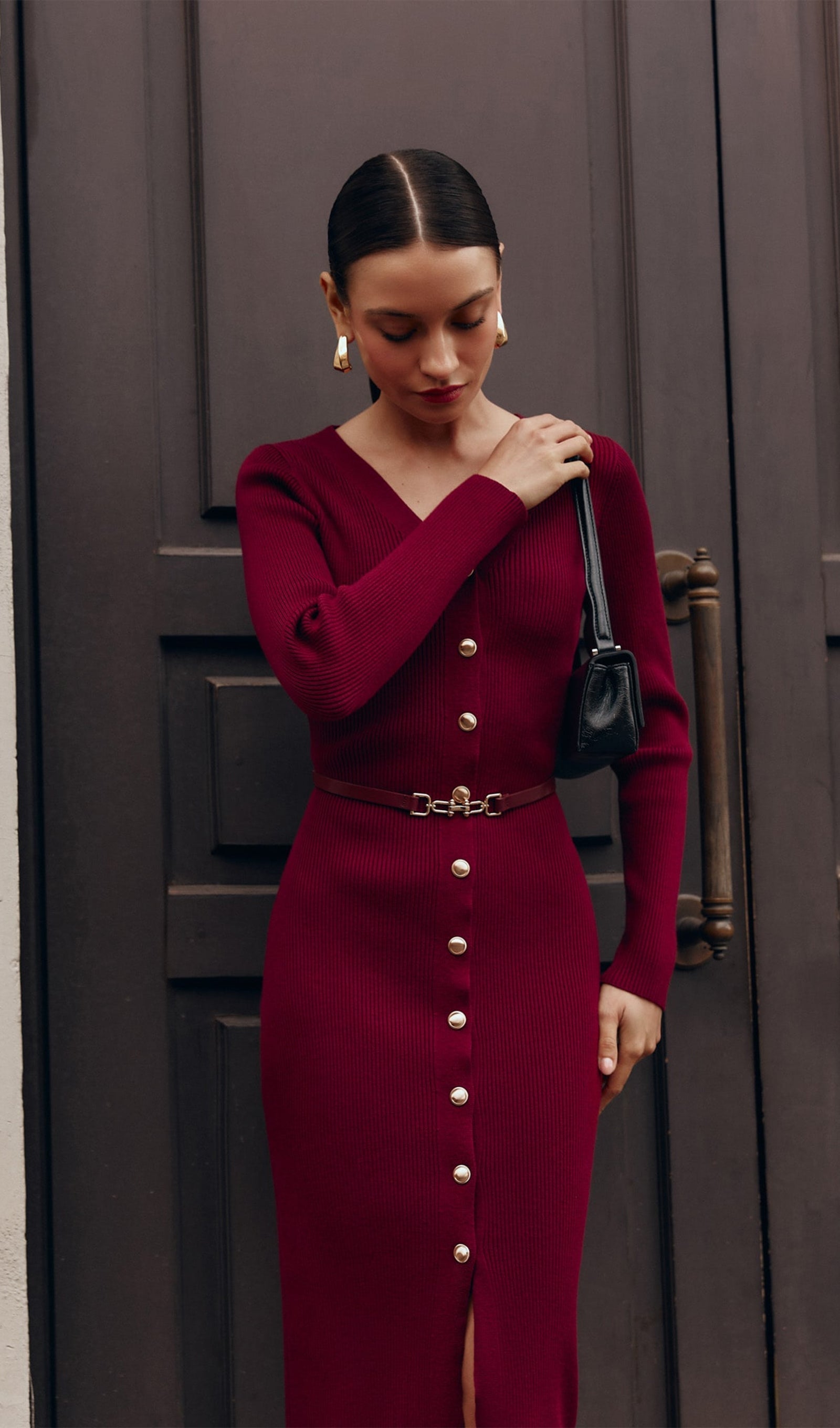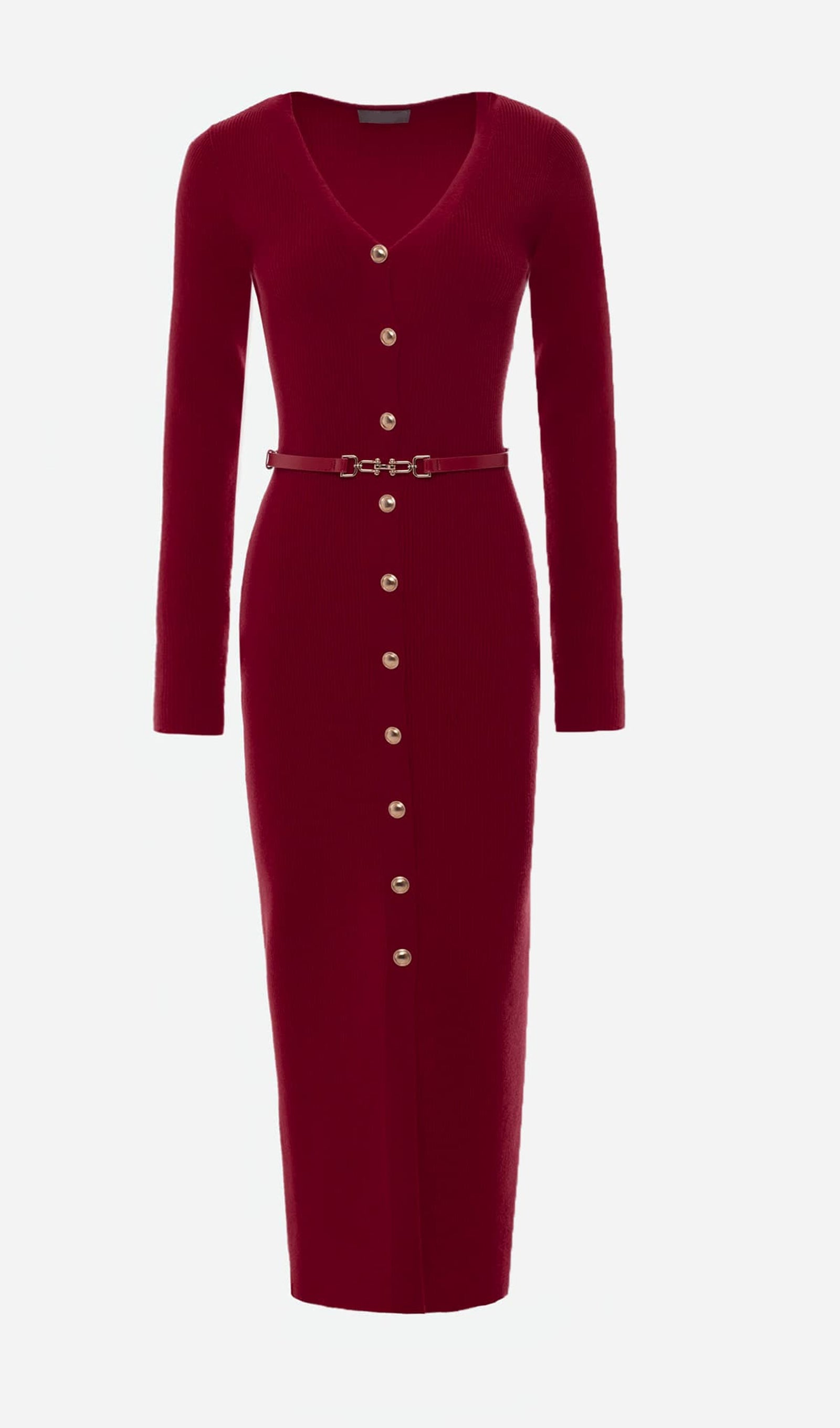 Örme V Yaka Kemerli Midi Elbise -Kırmızı
