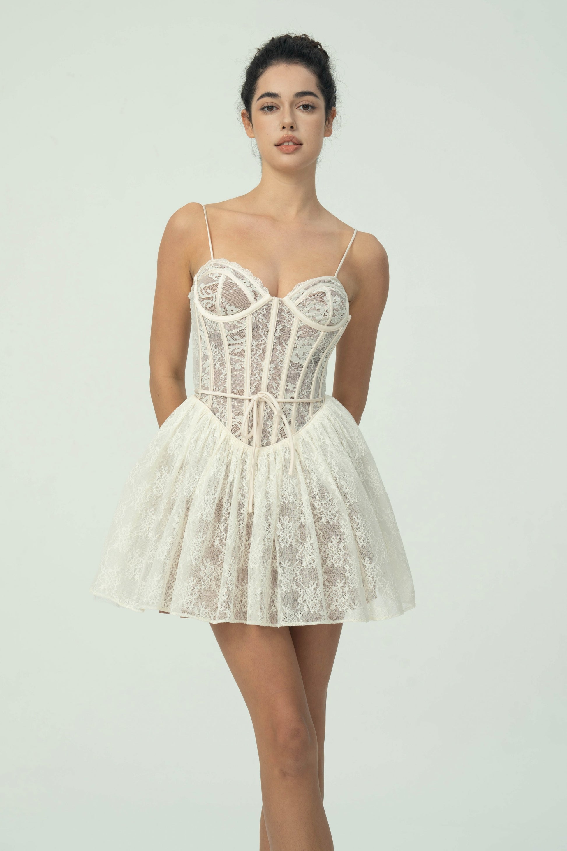 Kontrast Büstiyerli ve Fiyonklu Zarif Omuzları Açık Mini Elbise