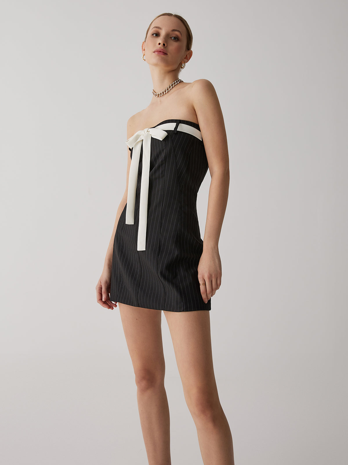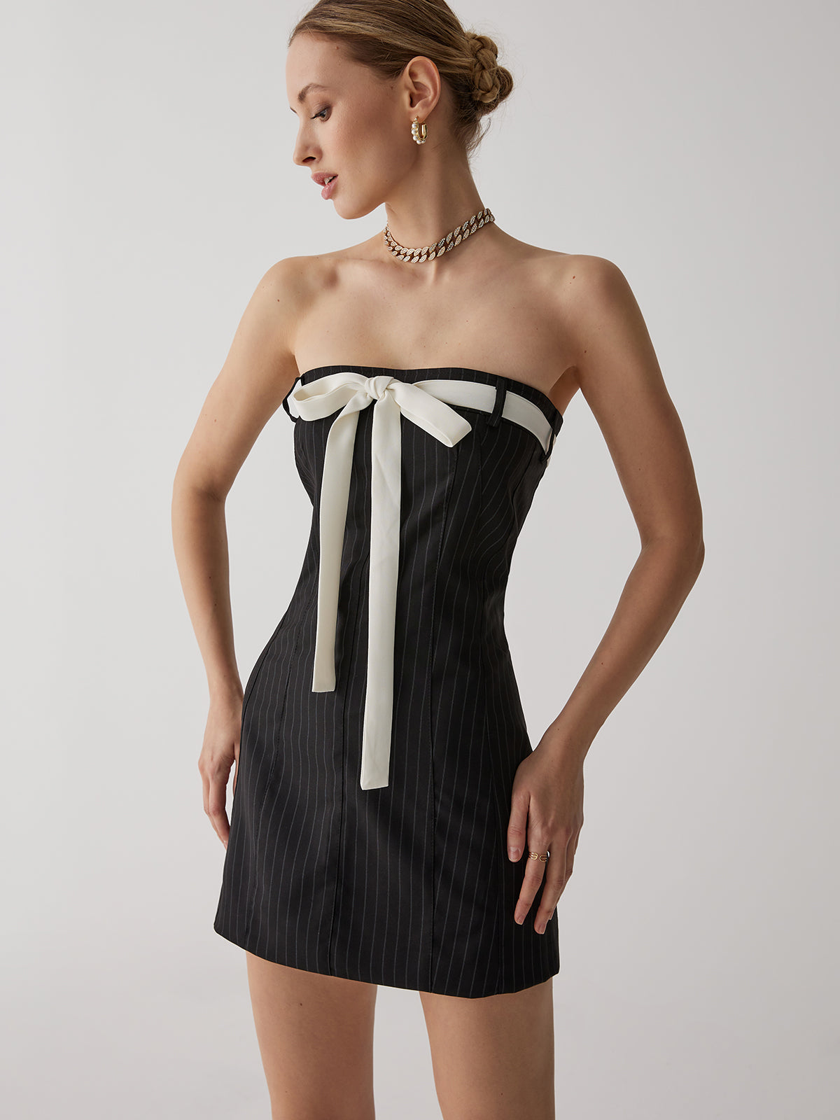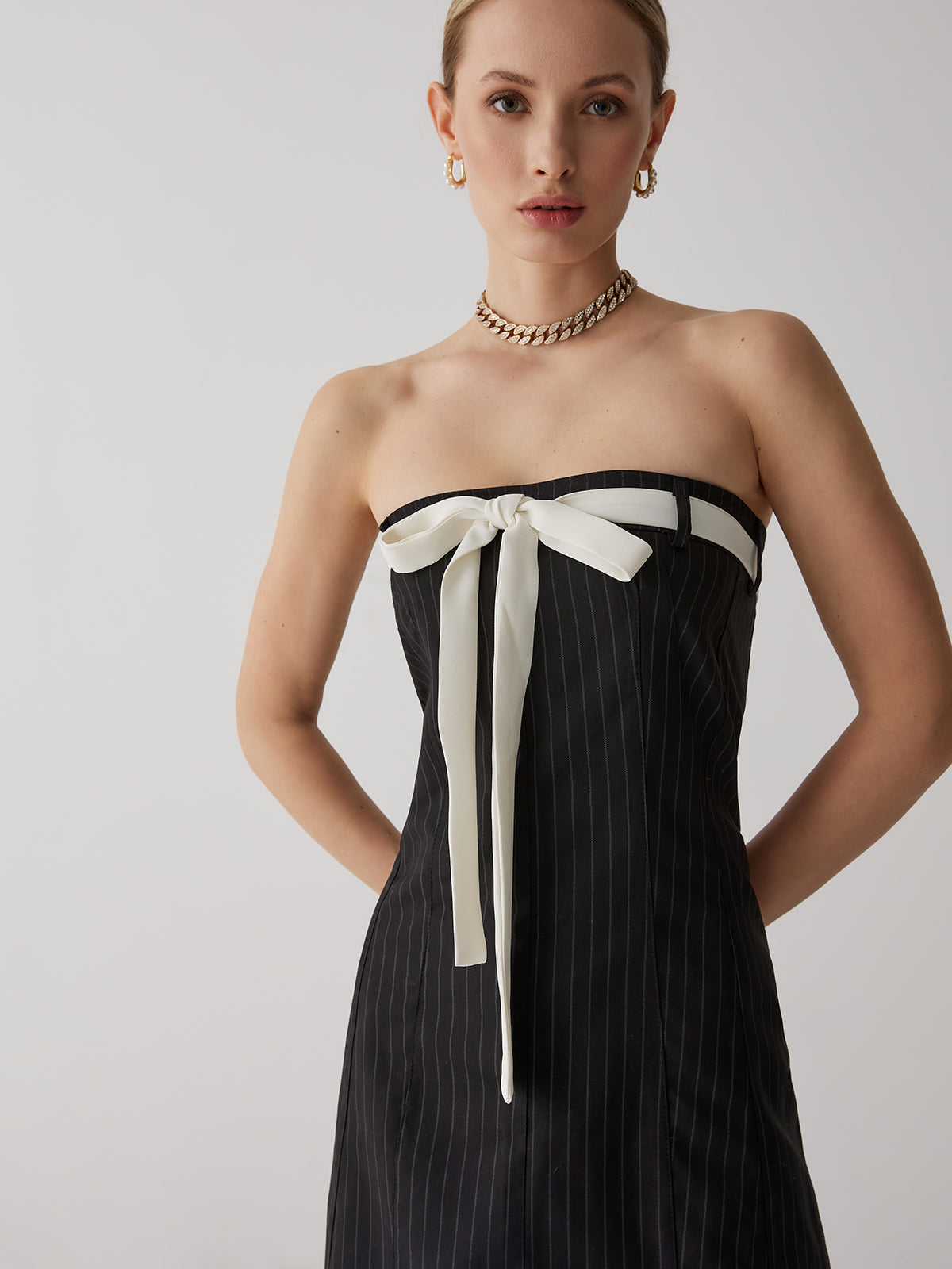 Çizgili Beyaz Fiyonklu Kısa Elbise
