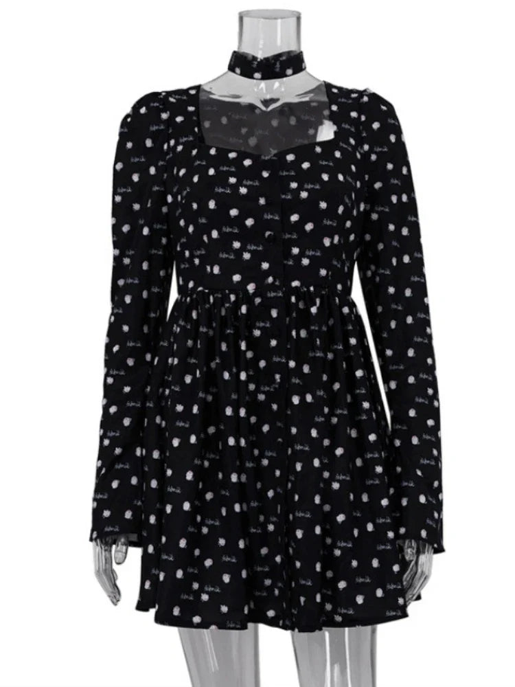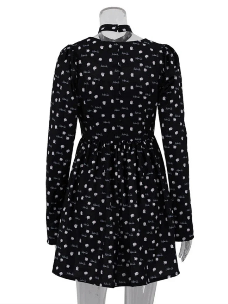 Puantiyeli Boyun Detay Uzun Kollu Mini Elbise