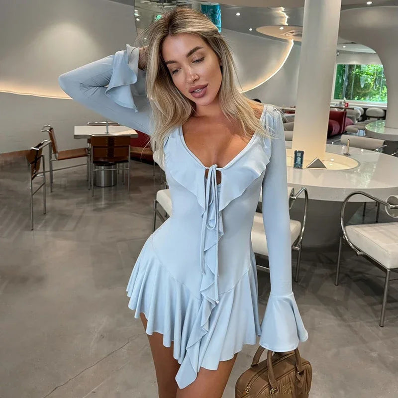 Derin V Yaka Fırfırlı Uzun Flare Kol Mini Elbise
