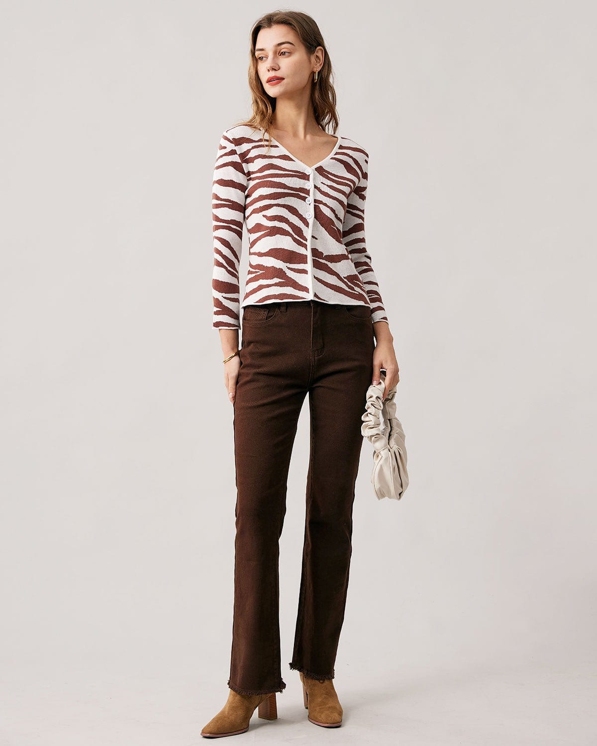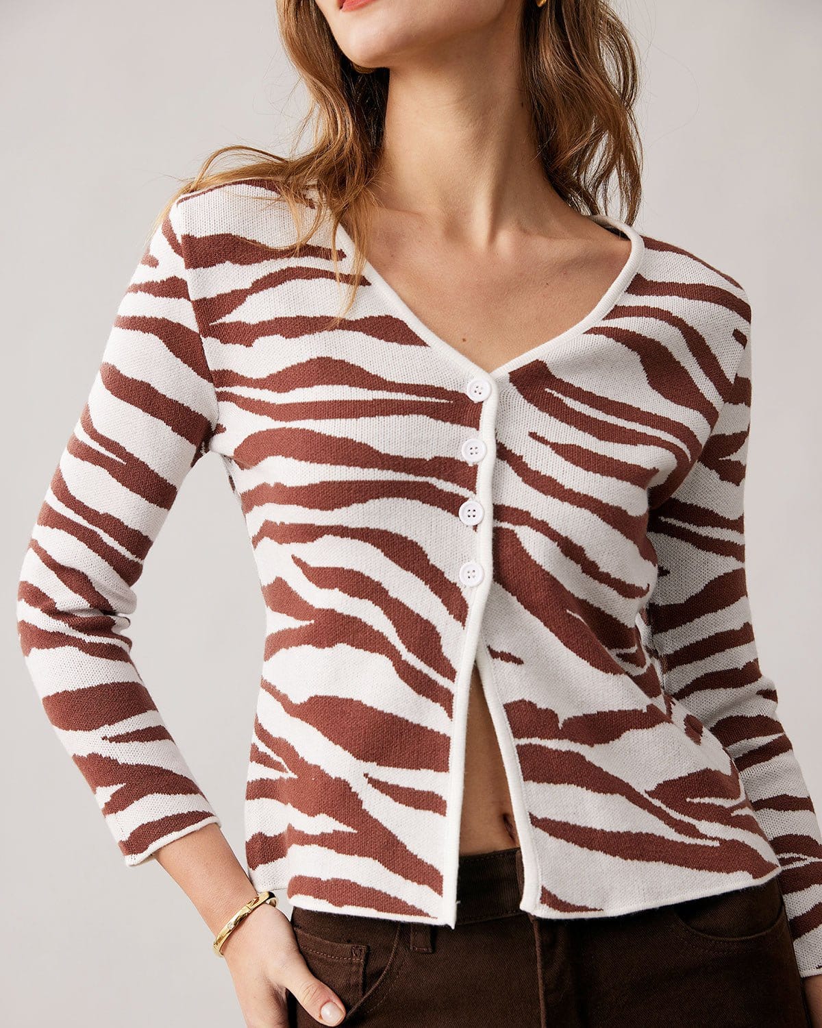 Kahverengi V Yaka Zebra Desenli Triko Hırka