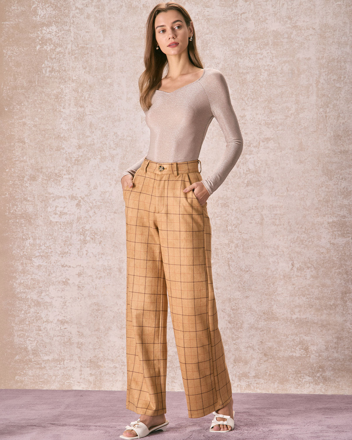 Bej Yüksek Belli Ekose Bol Paça Pantolon