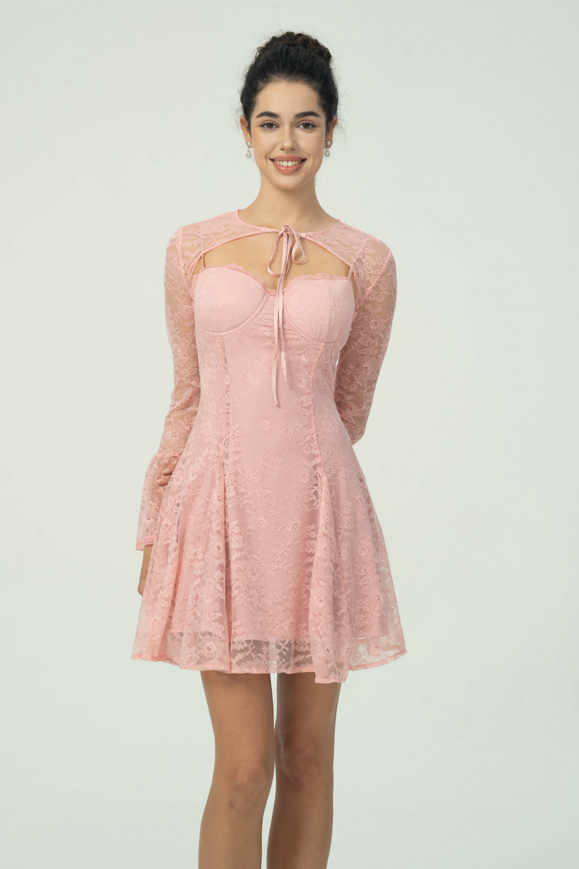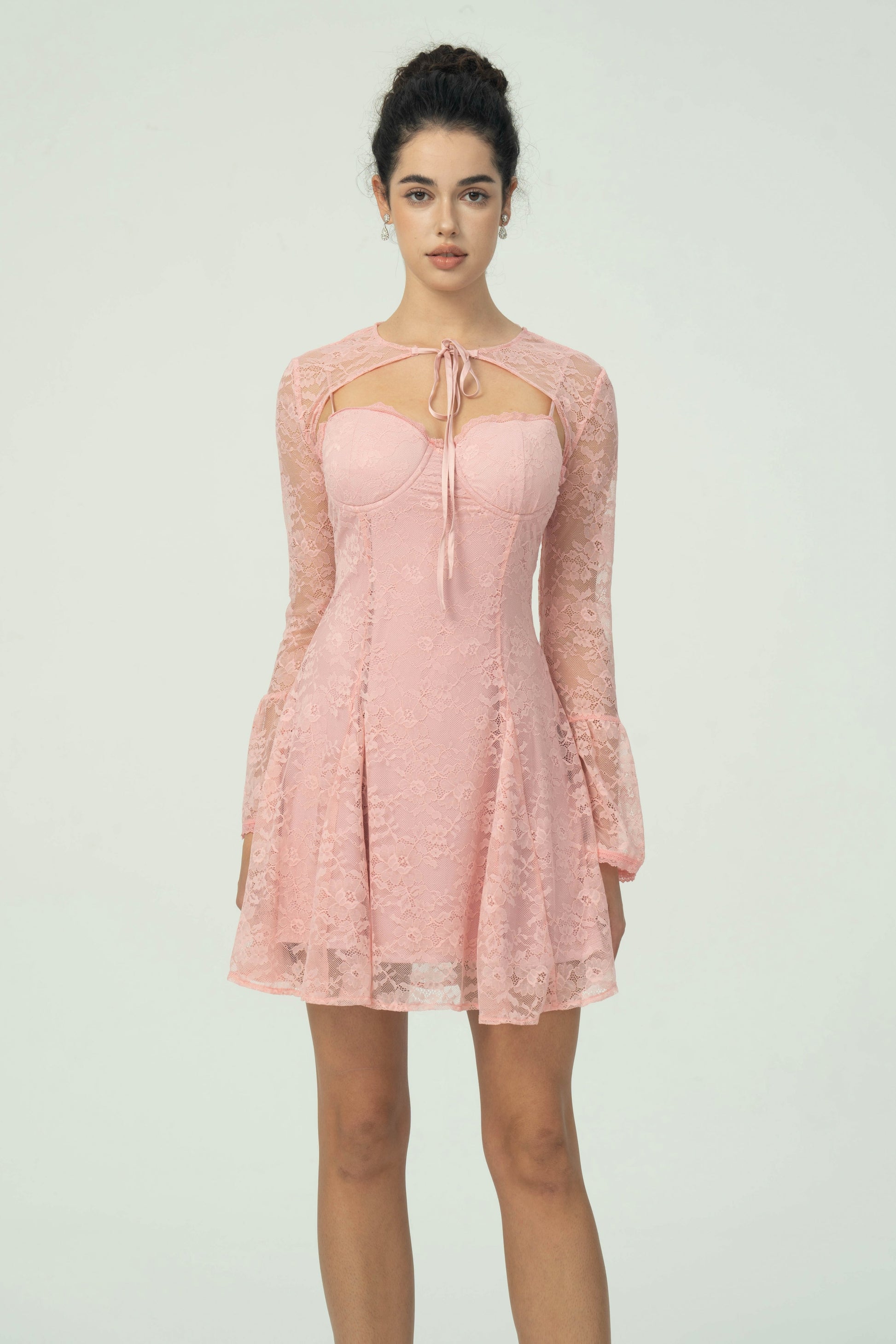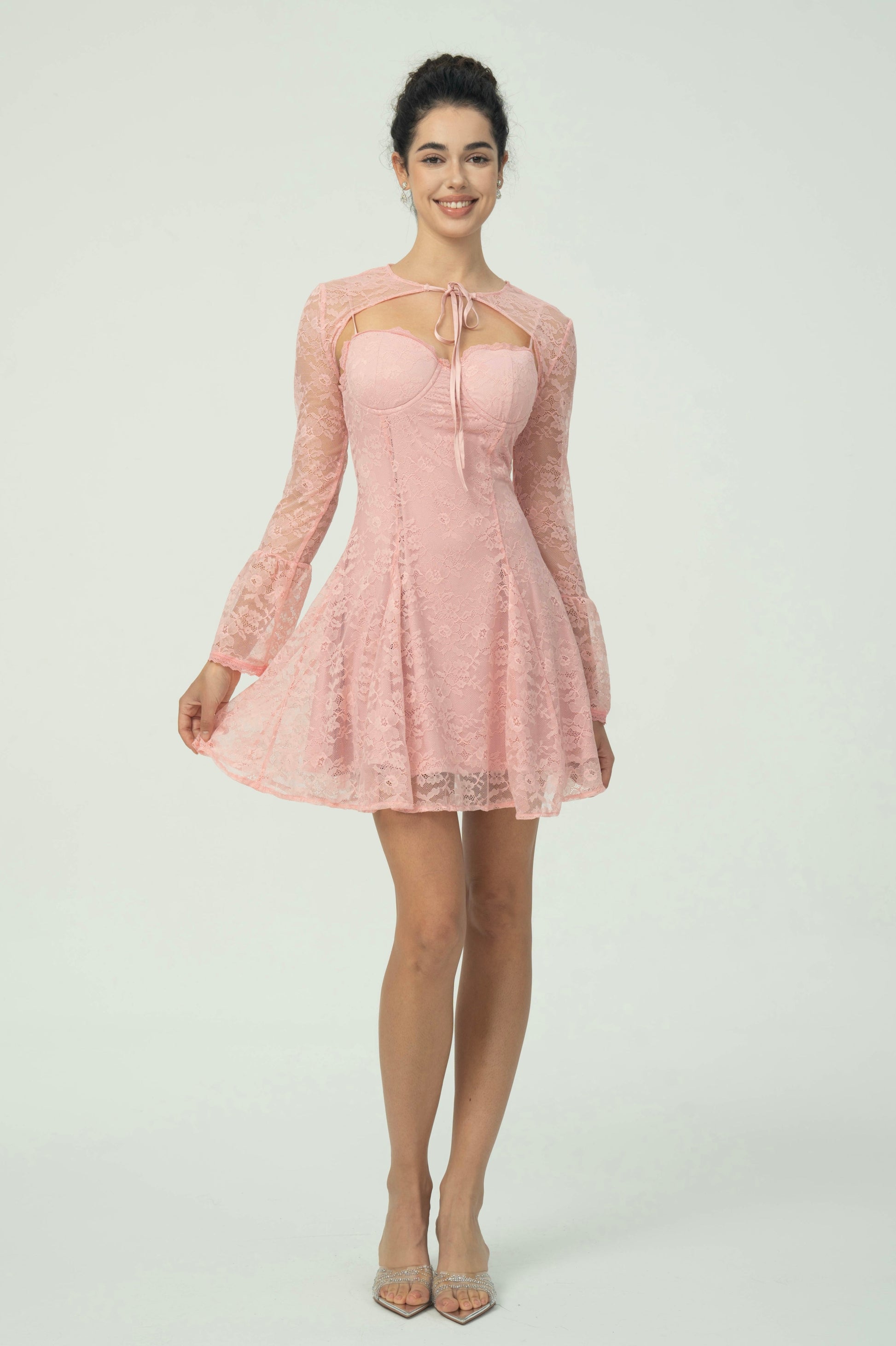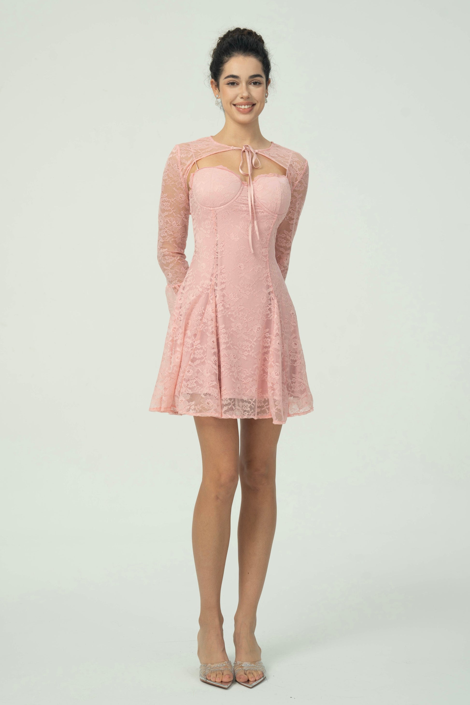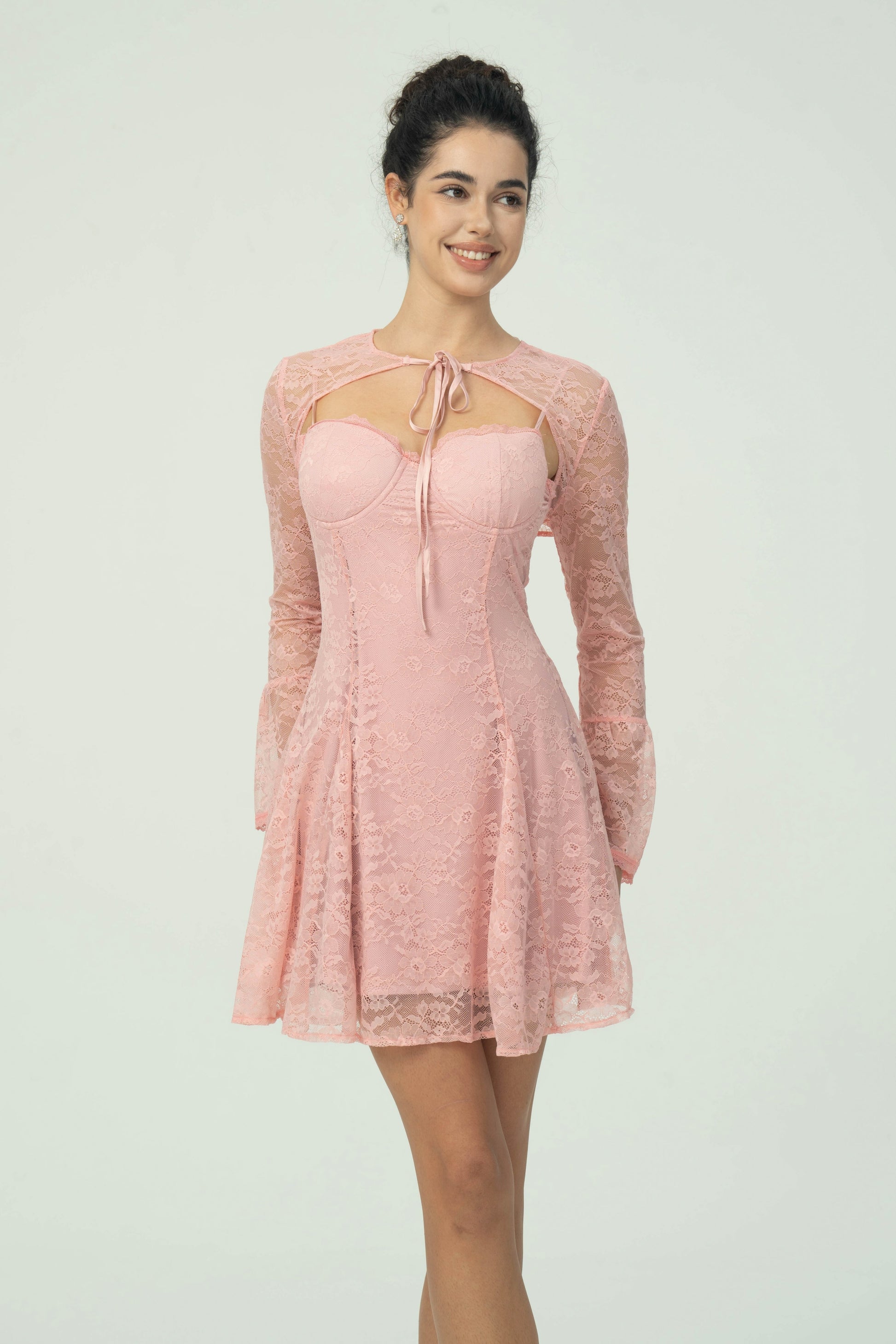 Bu şirin pembe dantel mini elbise, uzun dantel kolları, önden bağcık detayı ve kabarık etek kesimi ile tatlı ve feminen bir görünüm sunuyor. Zarif dantel dokusu, elbiseye romantik bir hava katarken, vücuda oturan gövde tasarımı beli vurgulayarak kusursuz bir siluet oluşturuyor.