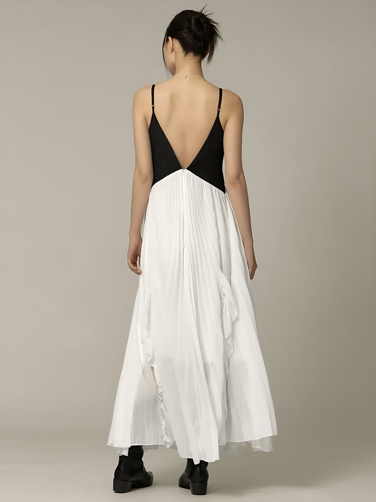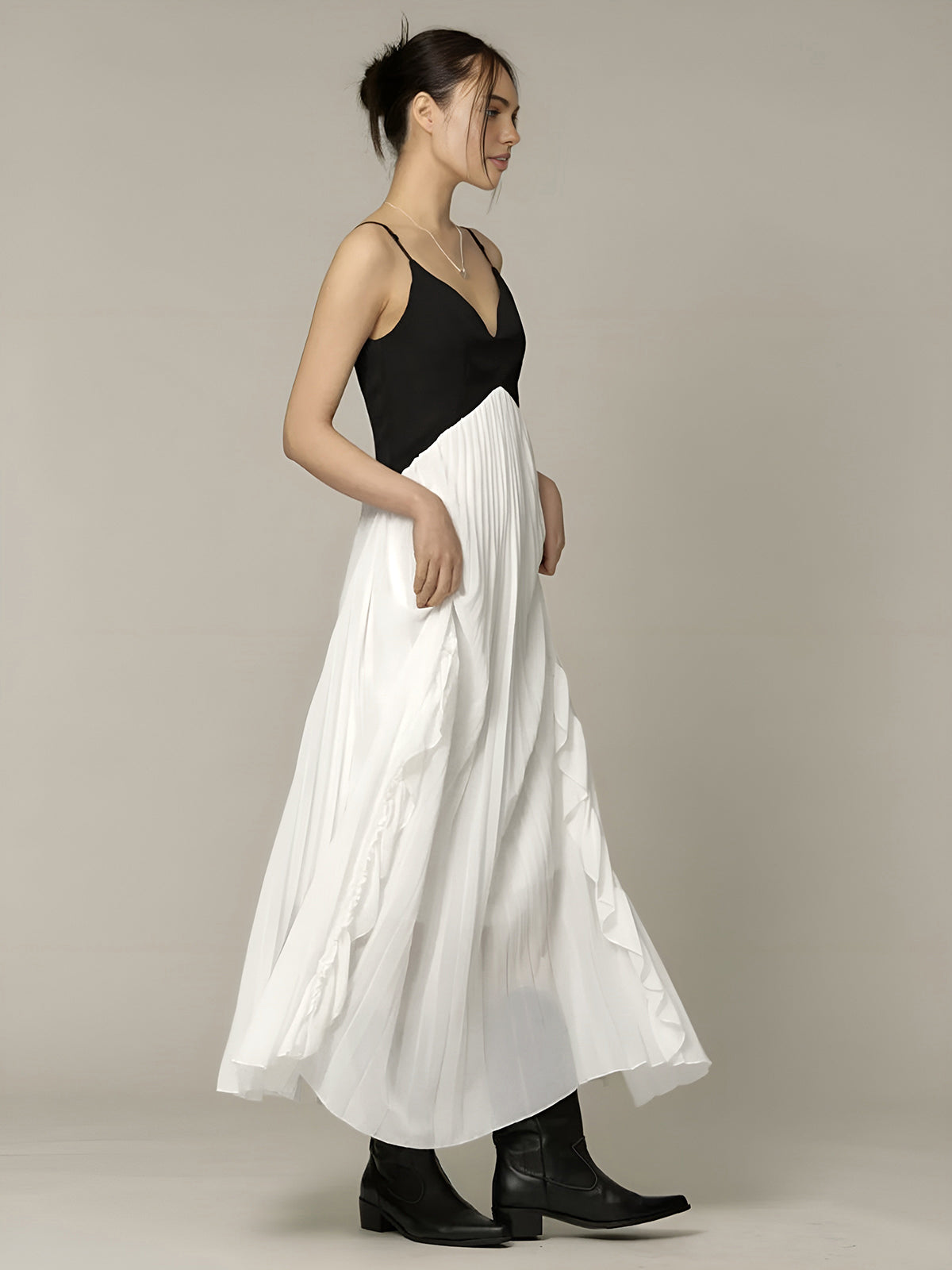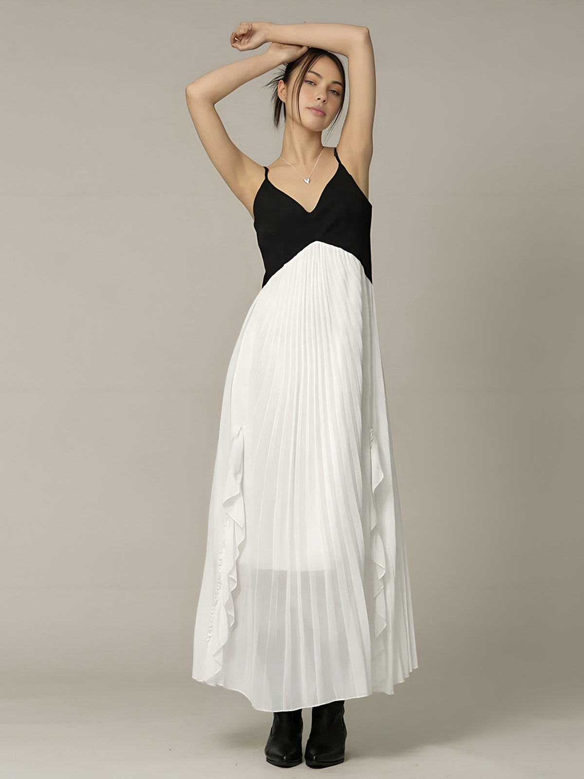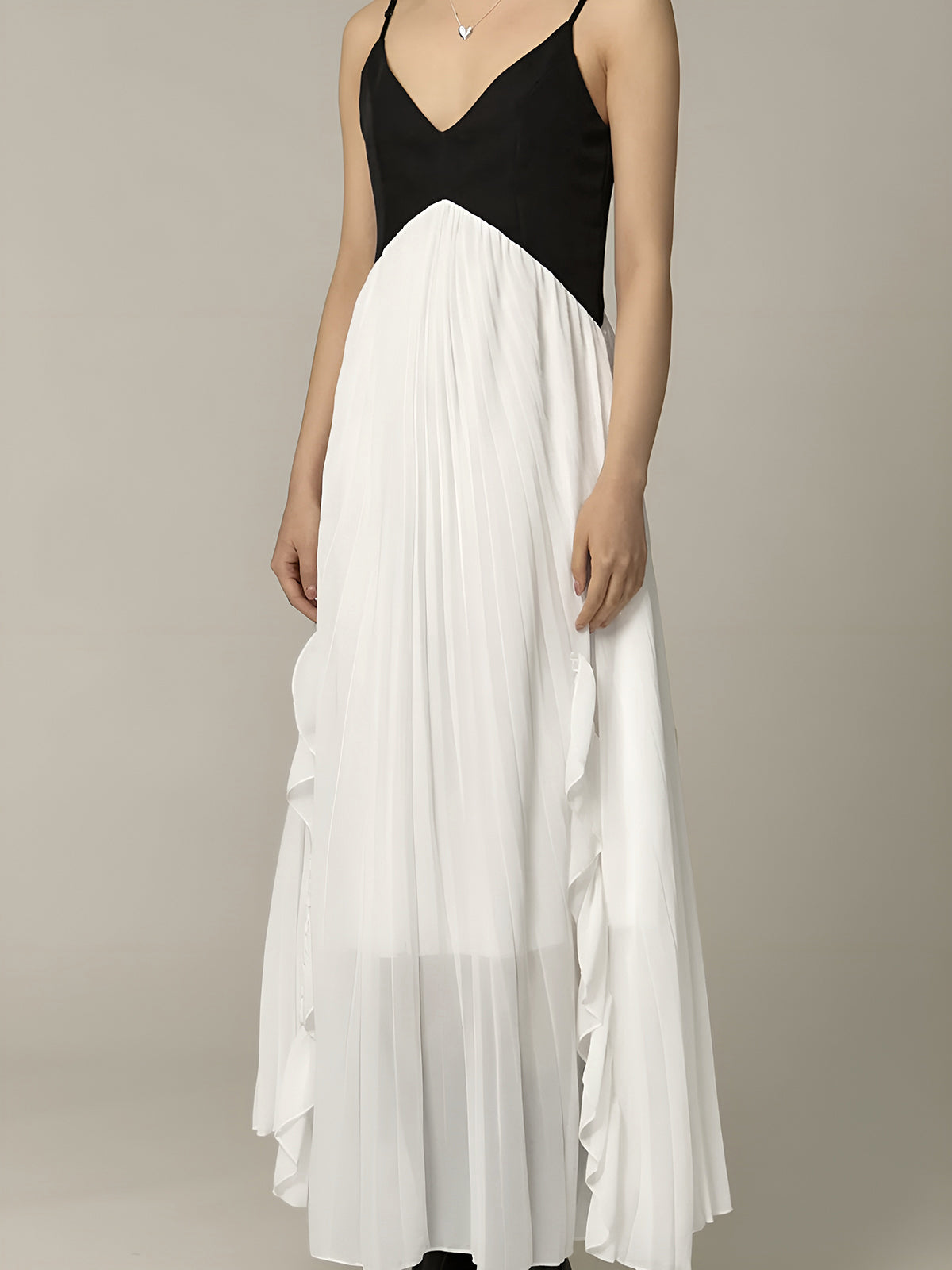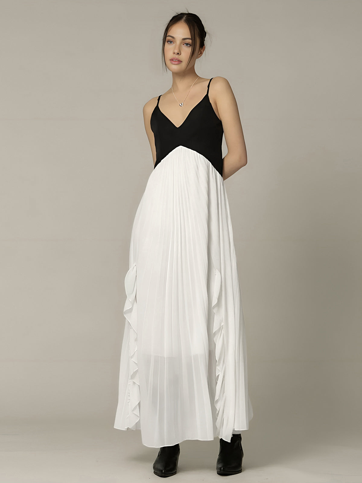 V Yaka Yandan Fırfır Dekorlu Pileli Uzun Elbise