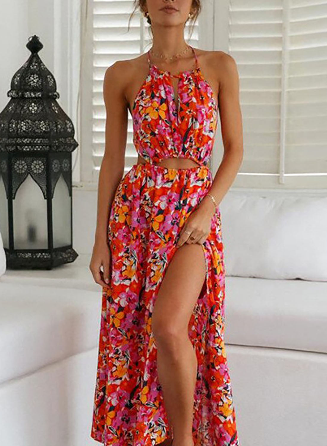 Çiçekli Sırt Dekolteli Maksi Elbise